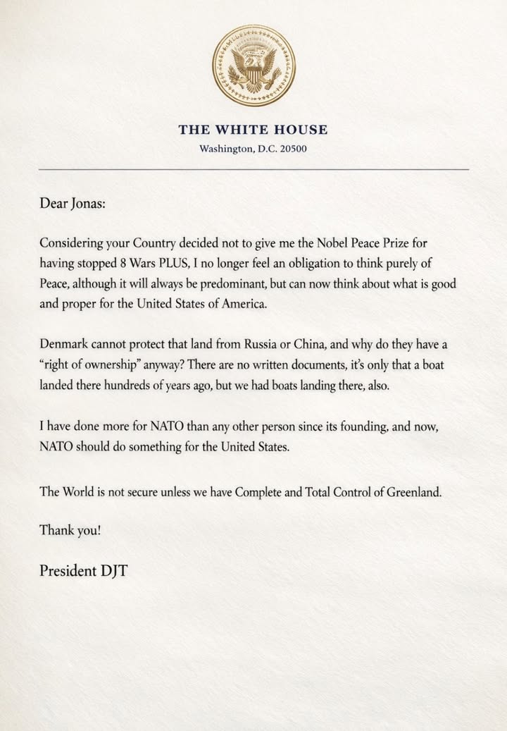Писмото, което Тръмп изпратил на премиера на Норвегия Йонас Стьоре звучи сюреалистично. Доналд, обяснява, че понеже скандинавската страна не му дала Нобеловата награда той обмисля насилствено анексиране на Гренландия ... Звучи като обяснение на 7 годишен сополанко. Но не е. В отделно изявление норвежкият премиер разказва, че Тръмп поставял въпроса за Нобеловата награда на всяка среща между двамата, въпреки, че всеки път Стьоре му обяснявал, че връчването й няма нищо общо с норвежката държава, а с решение на независим комитет.