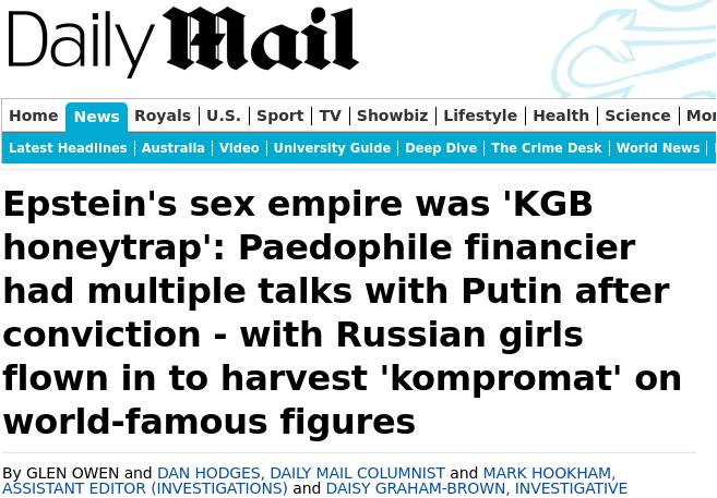⚠️Внимание, шокиращо съдържание! Сексуалната империя на Епщайн е била „КГБ секс-компроматен капан“, това пише британският Дейли Мейл, позовавайки се на източници от британското разузнаване. 📌 Финансистът-ne**фил е имал многократни разговори с Путин след осъждането си [през 2008 г.] 📌 руски момичета са били докарвани със самолети за събиране на „компромати“ срещу световноизвестни личности.