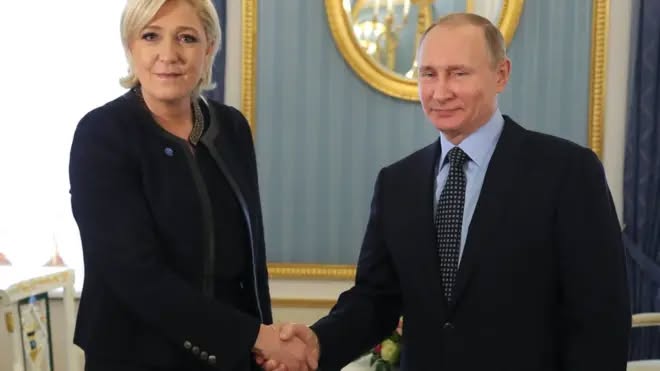 Файловете на Епщайн разкриват и нещо, което всички знаем - френската топ копейка Льо Пен е финансирана от Путин. В писмо до публициста Майкъл Уолф от 12 юли 2018, Епщайн предава разказа на Стив Банън за срещата му с Льо Пен и нейни съпартийци: "той [Стив Банън] се срещнал с френските десни, включително Льо Пен и съпруга ѝ, относно рефинансирането на партията Национален фронт, защото явно значителна част от парите им идват от Русия.