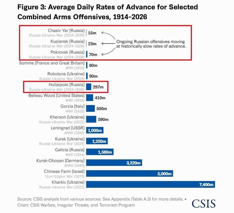NEXTA: Руската армия отбелязва най-бавния напредък за всички войни в Европа от последните 100 години война - само 15 метра на ден. Това показва изследване на американския център за стратегически изследвания (CSIS). Русия губи средно по 35 000 войници на месец. И все пак през последната година тя е превзела само 0,8% от територията на Украйна - и още 0,6% през 2024 г.