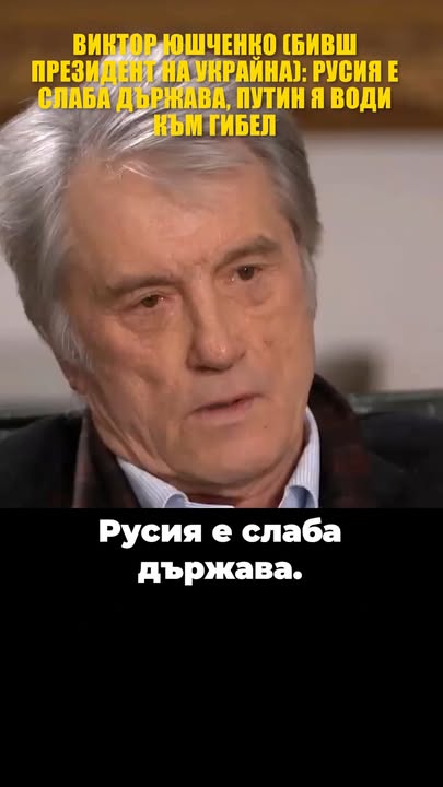 Виктор Юшченко: * Путин води Русия към гибел * Ще бъдете свидетели на разпада на путинската империя * Това е абсолютно закономерен процес * Това е страна която не може да произвежда технологии без Украйна * Основните им ресурси са природните богатства * Русия е дарена от Господ с най-големите природни богатства, а в същото време стандартът им е като на държава от третия свят --- Виктор Юшченко е премиер на Украйна от 1999 до 2001 и президент от 2005 до 2010.