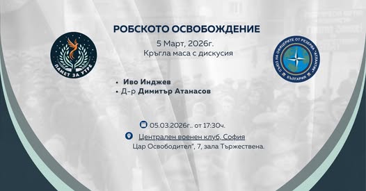 Oт името на Асоциация Памет за утре и Съюз на офицерите от резерва "Атлантик" бихме искали да Ви поканим на съвместното ни събитие на тема: "Робското освобождение" Кръглата маса с дискусия накрая ще се проведе на 05.03.2026г. от 17,30 ч. в зала "Тържествена" на Централен военен клуб, гр.София.