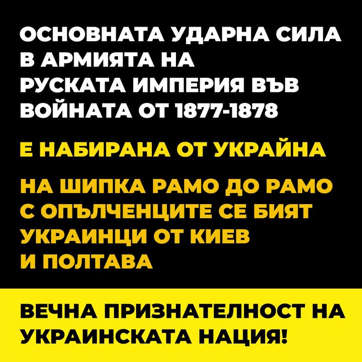 Тъй като поразените с московска дезинформация и пропаганда са свикнали да изразяват на 3-и март признателност единствено на руснаците: - напомняме, че във войната от 1877-1878 основната ударна сила на армията на Руската империя е набирана от територията на днешна Украйна - в редиците на руската армия се бият и поляци, финландци, естонци, латвийци, литовци, грузинци, арменци - напомняме, че Сан Стефанският мирен договор постановява ОКУПАЦИЯТА на България от Московията - напомняме, че Московията се бие не за свободата на България, а за имперски завоевания, за бленуваните Проливи, Константинопол и за своята империя.