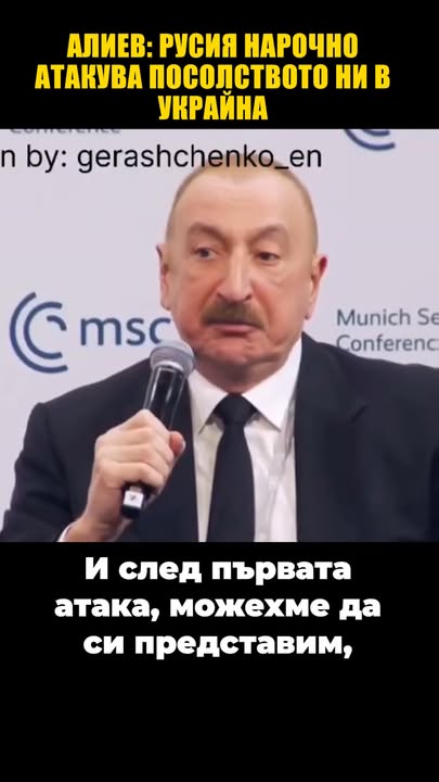 Алиев: Русия нарочно атакува посолството ни в Украйна Имаше не само атаки срещу енергийната инфраструктура на Азербайджан в Украйна, но и 3 пъти атаки срещу посолството на Азербайджан в Украйна. И след първата атака, можехме да си представим, че това е било случайно и ние дадохме на нашите руски колеги всички координати на дипломацията на Азербайджан представителства, включително консулски отдел, нашите културни центрове и посолство.