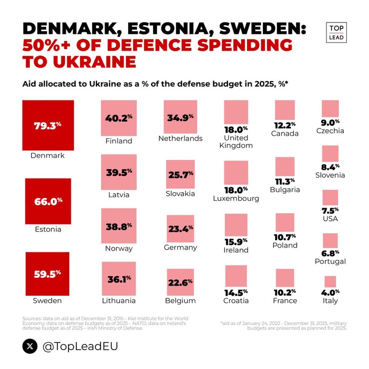 Дания, Естония и Швеция изразходват над 50% от военните си бюджети, за да помагат на Украйна във войната с Московия. Статистиката показва, че като цяло, колкото е по-малка една държава, толкова тя е по-склонна да подкрепя Украйна. Това е напълно естествено - малките държави са тези, за които спазването на международното право е от най-голямо значение - то е основният гарант за тяхната национална сигурност и независимост.