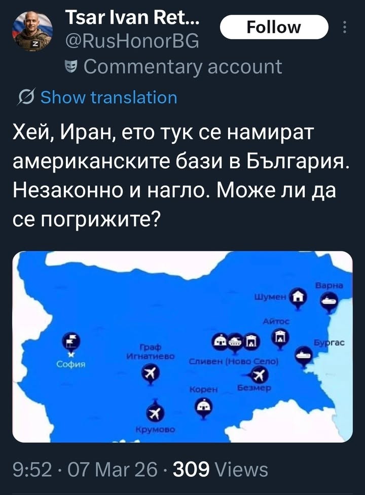 Това е един от профилите на Светослав Трайков, побеснял путинист. Вечно се вре някъде я за депутат или отговорна държавна служба. Мечтае джихадистите от Иран да ударят българските бази на НАТО в нашата родина, които пропагандата на Московията лъжливо представя за американски. България не познава по-големи национални предатели от слугите на Московията.