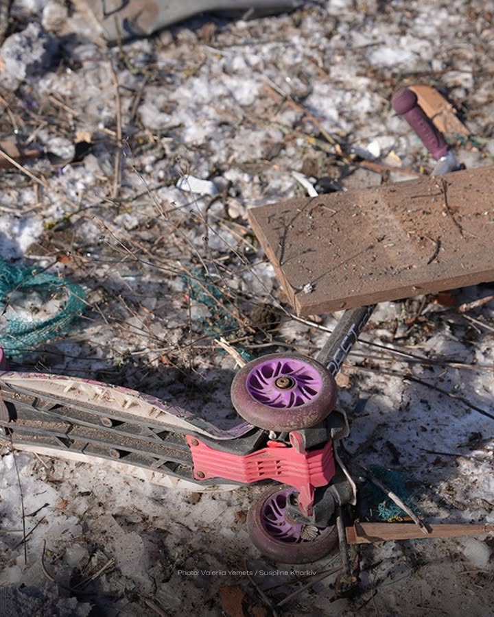 Протеза. Играчка. Тротинетка в снега и развалините. Това са останките от къща в Богодухов след руския удар с дрон на 10 февруари. Малко преди полунощ Московията порязява частна къща. Григорий Шикула, 34-годишен украински ветеран и трите му малки деца – две едногодишни момчета и двегодишно момиче са ybити.