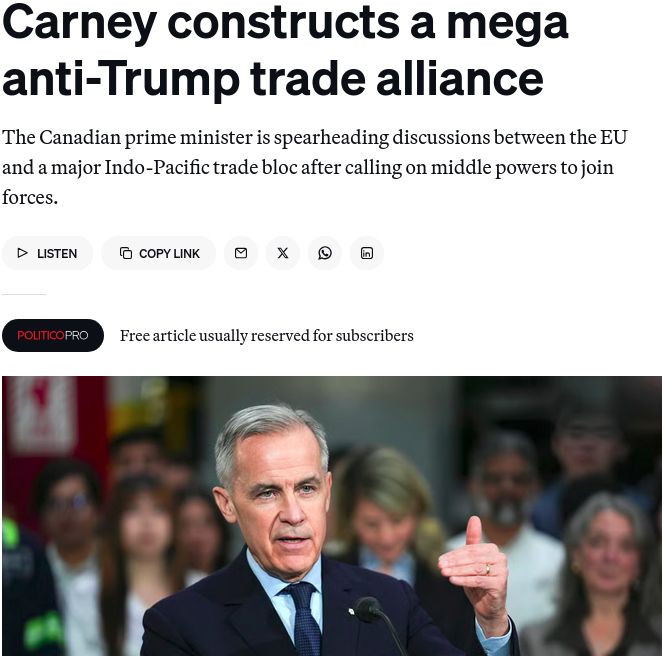 ‼️Канада, водена от Марк Карни, иницира създаването на гигантски търговски алианс между ЕС и индо-тихоокеанския блок CPTPP (12 държави), който изолира САЩ, водени от оранжевия фюрер в Белия дом. Целта: защита срещу митническата политика на Тръмп и намаляване на зависимостта от нестабилни търговски отношения.