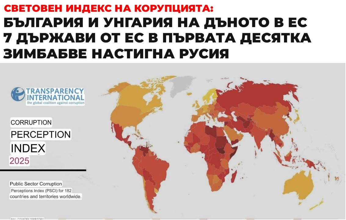 България и Унгария са на последно място сред държавите в ЕС в Индекса за възприятие на корупцията на Transparency International за 2025-а. Индексът измерва как бизнесът и гражданите възприемат нивото на корупция в публичния сектор. България получава 40 точки и заема 84-то място в света, заедно с държави като Унгария, Буркина Фасо, Куба, Гвиана, Северна Македония и Танзания.
