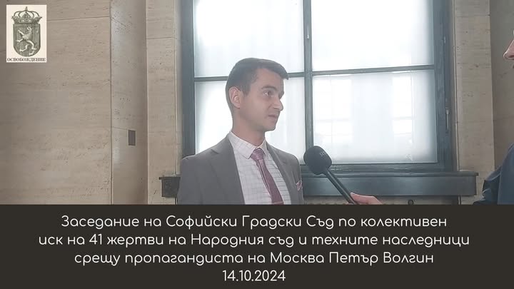 На 14 октомври 2024 от 13:30 в Софийски градски съд (СГС) ще се проведе заседание по колективен иск (гр.д. № 8053/2023) на 41 ищци срещу пропагандиста на Москва Петър Волгин. Техните интереси по делото се защитават от адв. Веселин Видолов. Призоваваме всеки, който може да присъства на заседанието. Именно в тези тревожни времена, когато над България е надвиснала опасността от повторение на мракобесието след 9.